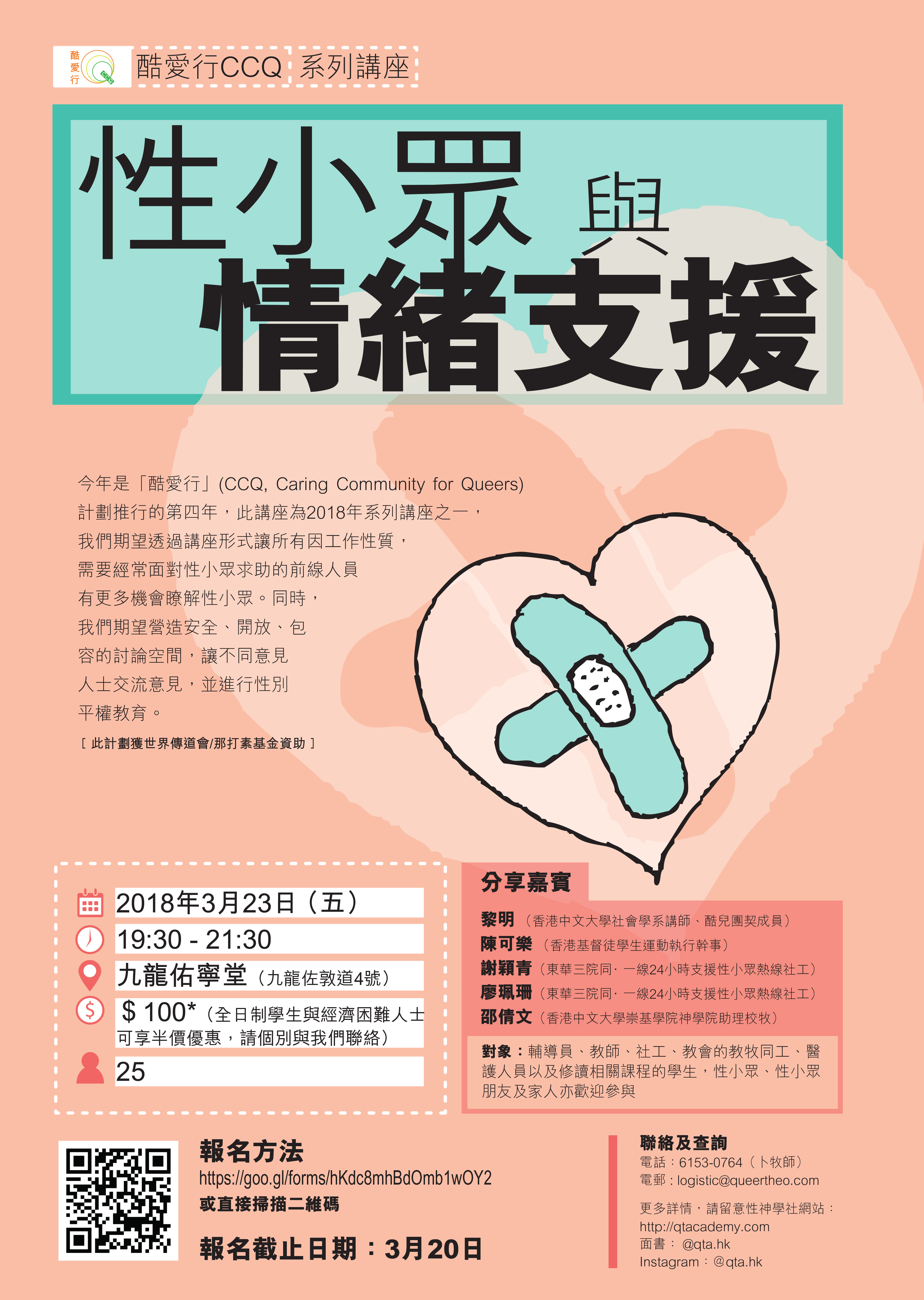 今年是「酷愛行」(CCQ, Caring Community for Queers) 計劃推行的第四年,此講座為2018年系列講座之一,我們期望透過講座形式讓所有因工作性質,需要經常面對性小眾求助的前線人員有更多機會瞭解性小眾。同時,我們期望營造安全、開放、包容的討論空間,讓不同意見人士交流意見,並進行性別平權教育。 [此計劃獲世界傳道會/那打素基金資助]